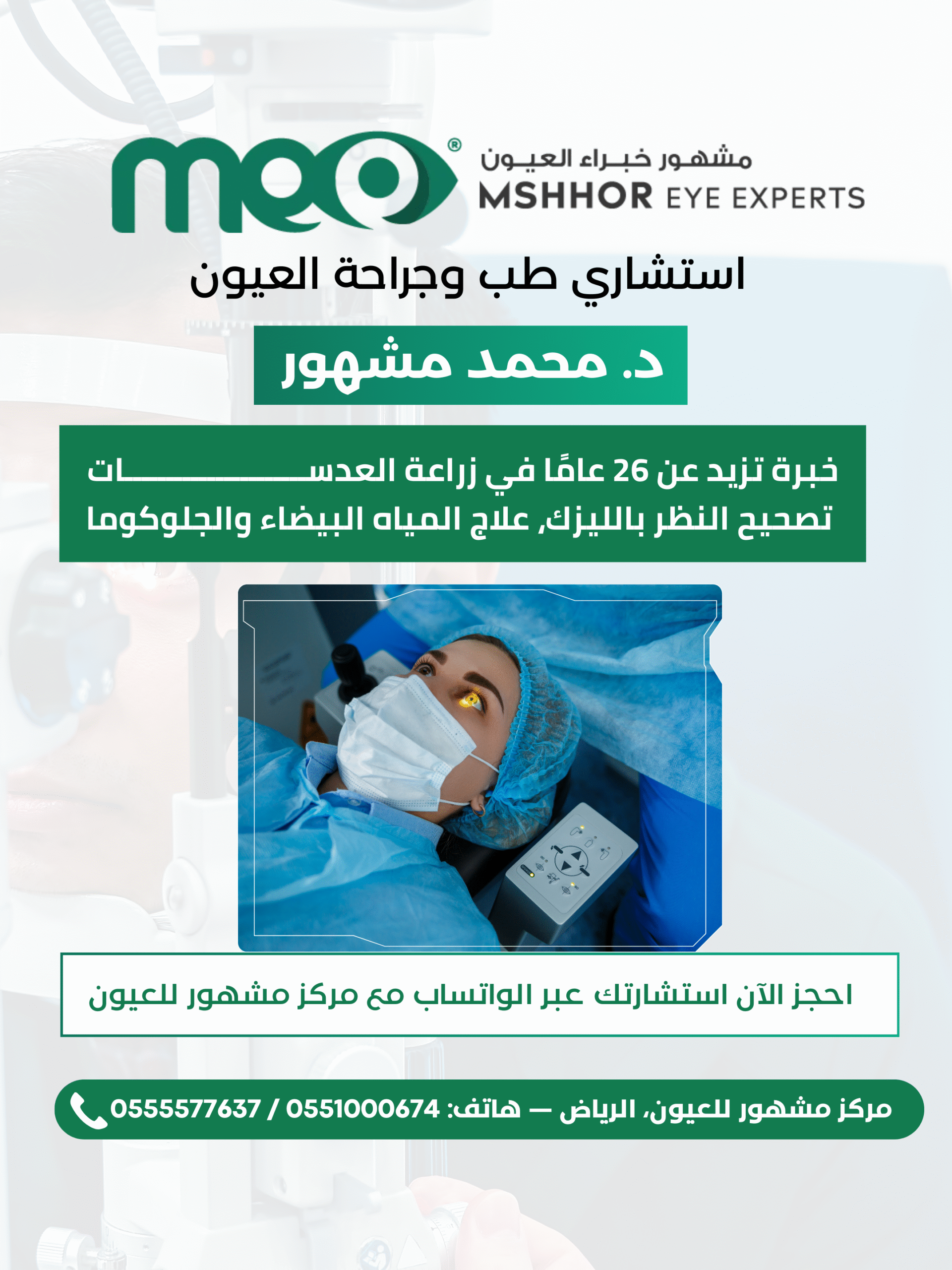 عندما يتعلق الأمر بصحة عيونك، فإن الاختيار الأمثل يكون في اختيار افضل مركز عيون بالرياض، حيث نقوم باختيار أفضل فريق استشاري طب وجراحة العيون بالتعاون مع الدكتور محمد مشهور أحد أهم استشاري العيون في مستشفيات المملكة مثل مستشفى الملك خالد التخصصي ومستشفى مدينة الملك فهد الطبية بالرياض، حيث نقوم في مشهور على تقديم خدمات علاجية متقدمة تشمل عمليات تصحيح النظر بتقنية الليزك، إزالة المياه البيضاء، زراعة العدسات، وعلاج الجلوكوما وأمراض الشبكية، حيث يحرص الدكتور مشهور برعايته الدقيقة من أجل الحفاظ على سلامة المرضى، معتمدًا على أحدث التقنيات الطبية لتحقيق أفضل النتائج الممكنة.